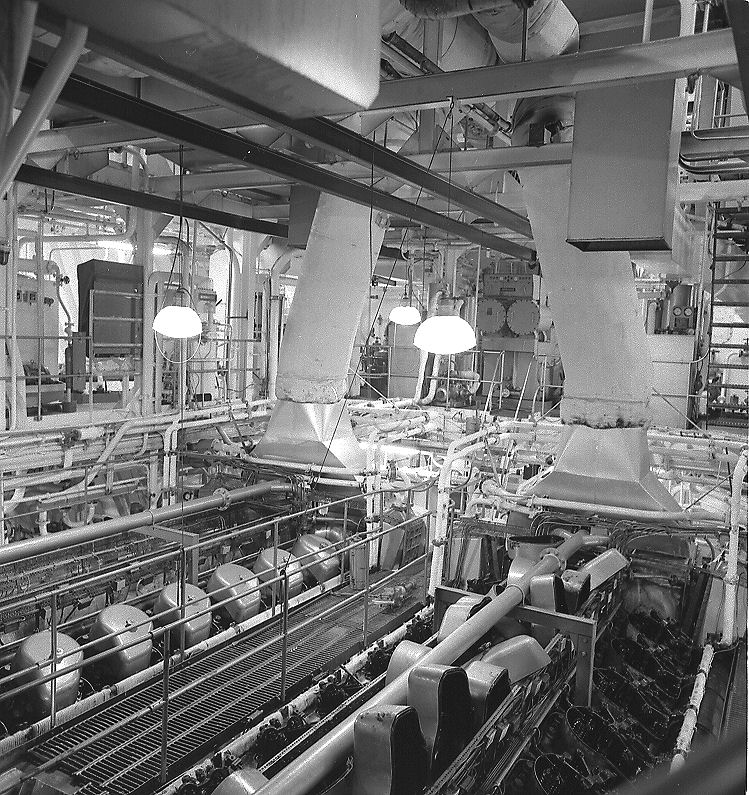 The engines were started on marine diesel fuel and then changed over to run on heavy oil when not in a seaway. i.e. when deep-sea. Each engine ran at 450 rev/min and drove a shaft alternator. One shaft alternator could run the entire vessel. There were also two V8 auxilliary Paxman generators.