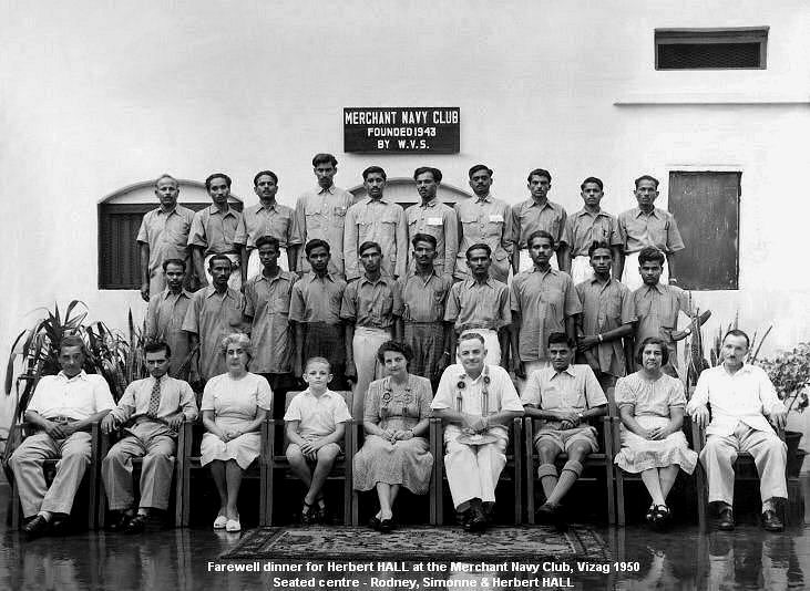 ![]() Farewell dinner for Herbert Hall and family at the Merchant Navy Club, Vizag, 1950. Seated centre, Rodney, Simonne and Herbert Hall. |