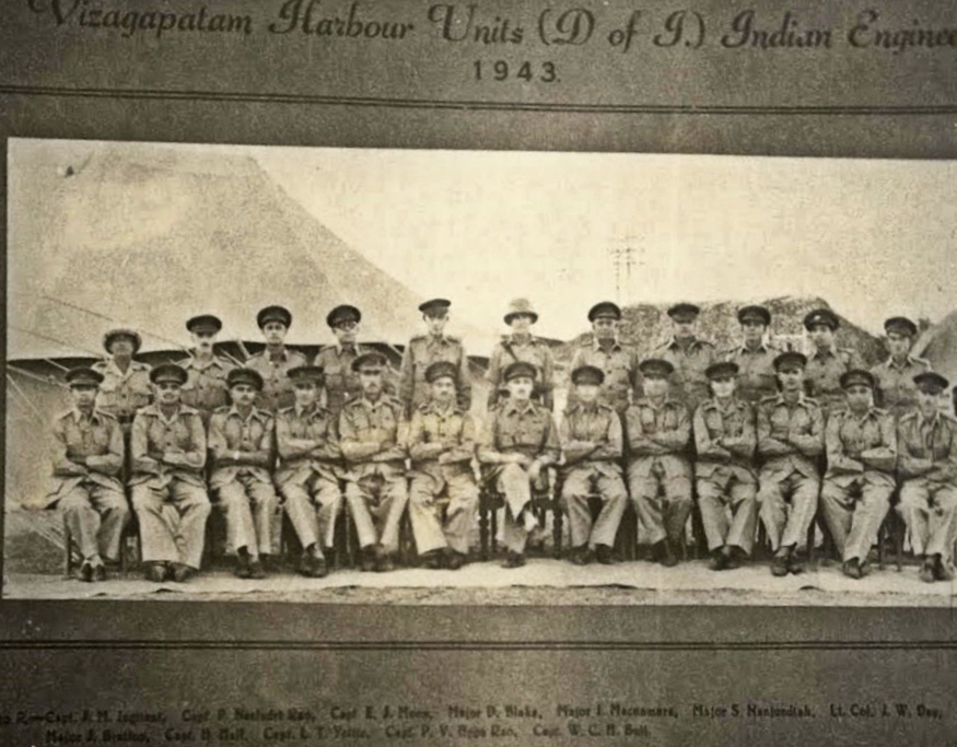 When my father became Harbour Master, we moved nearby into the Port Officer's Bungalow, where we lived until we left India in 1950. During WWII, the Vizag Harbour Indian Engineers Unit was formed, and my father joined as Captain. During the war, there was considerable Japanese submarine activity outside Vizag and the harbour was repeatedly bombed. The harbour was an important target due to the export of manganese ore and the building of ships in Scindia's yard. My father and other members of the Harbour Unit set up posts amongst the trees on the Dolphin's Nose hill at the harbour entrance and, with their .303 rifles, picked off many of the Japanese bomber pilots as they flew low to bomb the port - they never knew what hit them! We had an anti-aircraft gun in the corner of our compound at the Port Officer's Bungalow, but I don't know if we got any aircraft with it!![]() Officers of the Vizag Harbour Indian Engineers, Unit – 1943. Capt. Herbert Hall is 4th from right, front row |