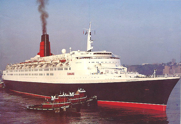 | RMS Queen Elizabeth 2 arriving in New York, with Moran tugs attending. |